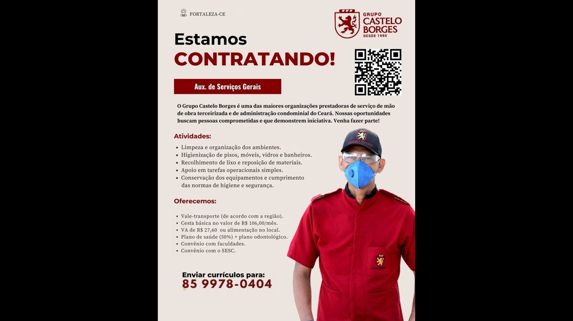 Estamos em busca de um Auxiliar de Serviços Gerais para se juntar à nossa equipe no Castelo Borges Administração.Este é um ótimo momento para você ingressar em um ambiente dinâmico e colaborativo, onde sua dedicação e comprometimento são valorizados.